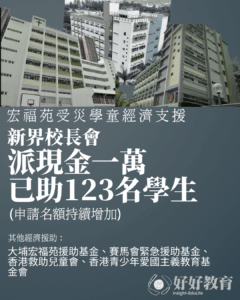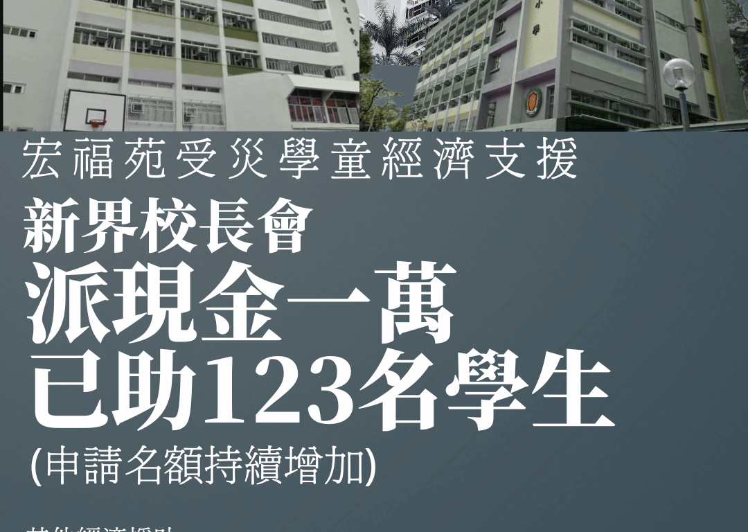 新界校長會獲多個團體及善長捐款,特設緊急援助金,讓各校長根據學生家庭受災情況,提名受影響家庭獲派一萬現金,以解燃眉之急。
